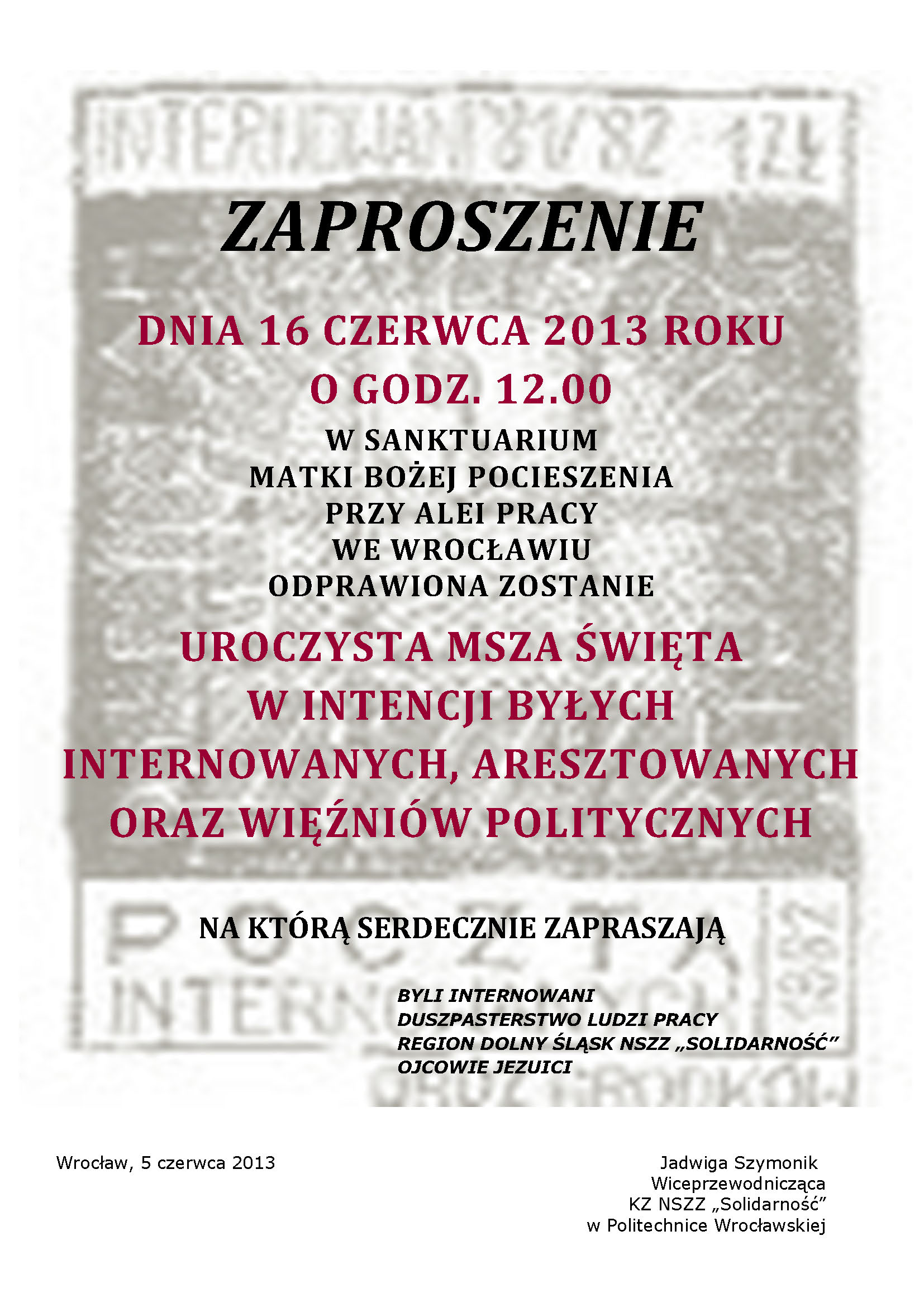 PRL, która zostanie odprawiona 16 czerwca 2013 roku, o godz. 12.00 w